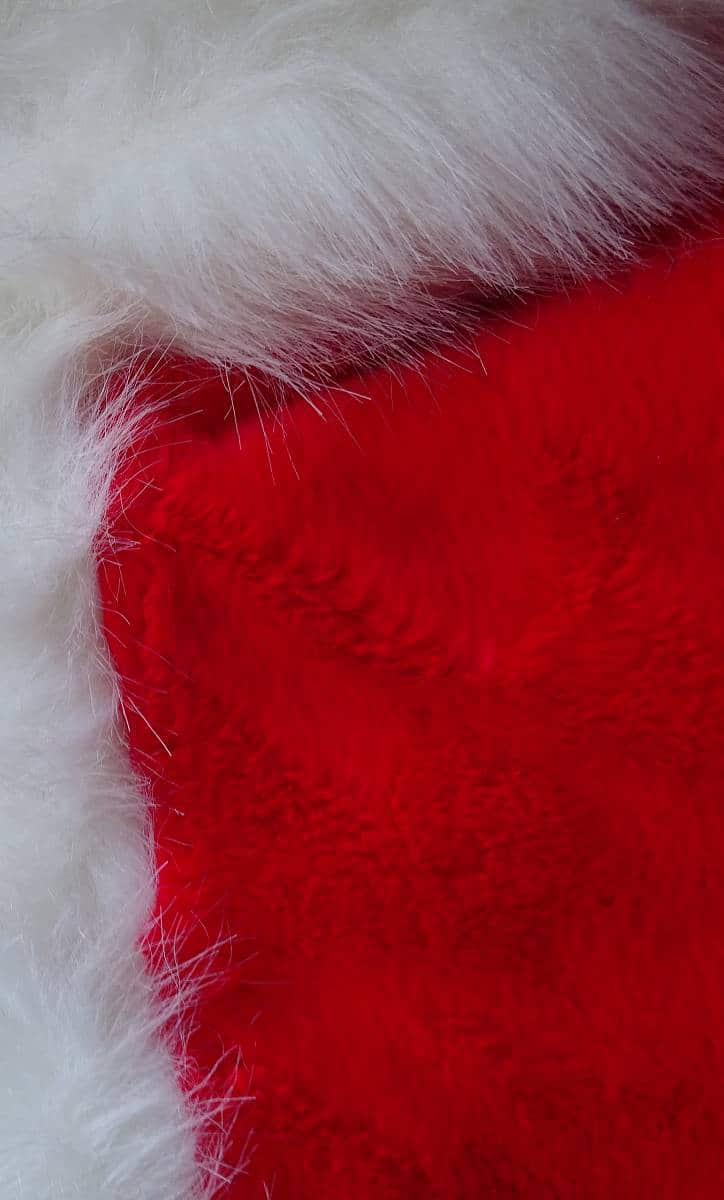Un vêtement pour professionnels confectionné dans une peluche rouge de haute qualité. Le costume luxe est garni de fourrure synthétique blanche à poils longs et il est entièrement doublé de satin.