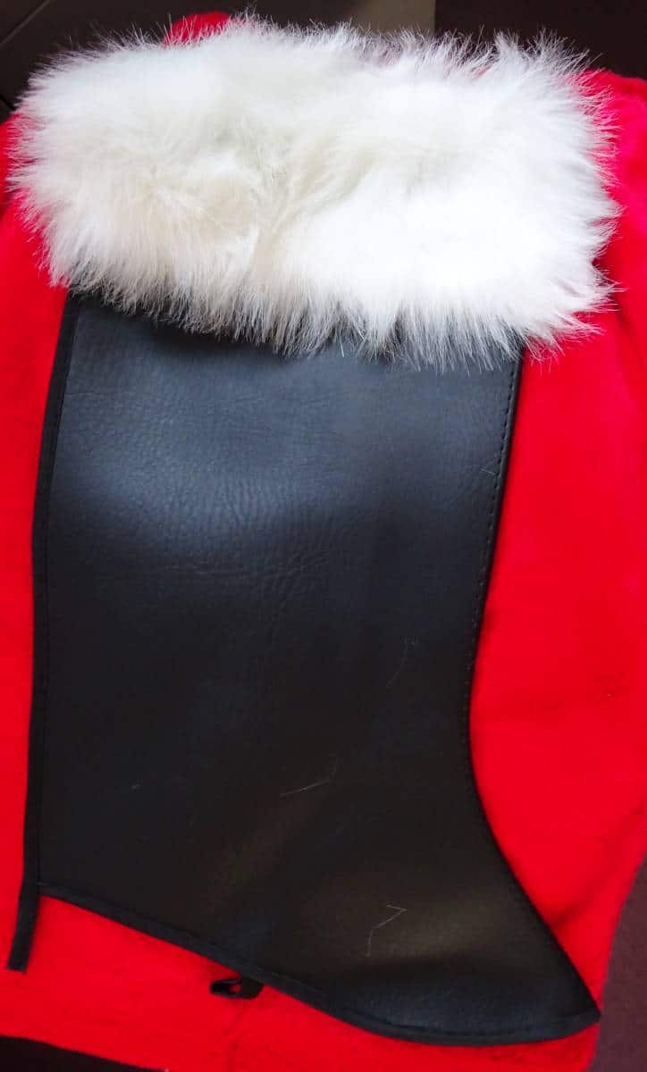 La fourrure qui apparaît sous les genoux se trouve sur le haut des sur-bottes, pas sur le pantalon. Les Pères Noël Pro choisissent souvent de remplacer ces fausses bottes par de vraies bottes de Père Noël, elles aussi bordées de fourrure blanche et qui donnent un aspect ‘réaliste’ à la tenue des spécialistes de la fête de Noël.