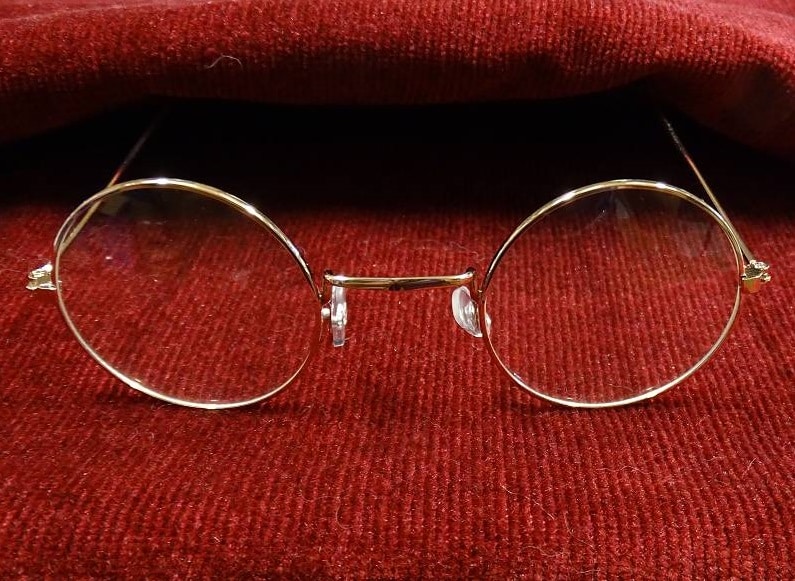 Paire de lunettes de Père Noël à monture dorée ronde, avec verres.